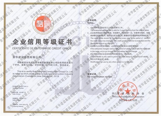 近日中國(guó)建筑業(yè)協(xié)會(huì)對(duì)我集團(tuán)信用狀況進(jìn)行了專業(yè)化考評(píng),我集團(tuán)憑借優(yōu)異的經(jīng)營(yíng)管理能力、良好的社會(huì)誠(chéng)信,評(píng)定結(jié)果為AAA級(jí),蟬聯(lián)“全國(guó)建筑業(yè)AAA級(jí)信用企業(yè)”。