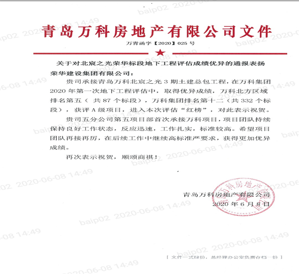 近日,青島萬(wàn)科房地產(chǎn)有限公司發(fā)來(lái)表?yè)P(yáng)信,對(duì)五公司第五項(xiàng)目部施工的青島萬(wàn)科北宸之光3期土建總包工程提出了表?yè)P(yáng)。