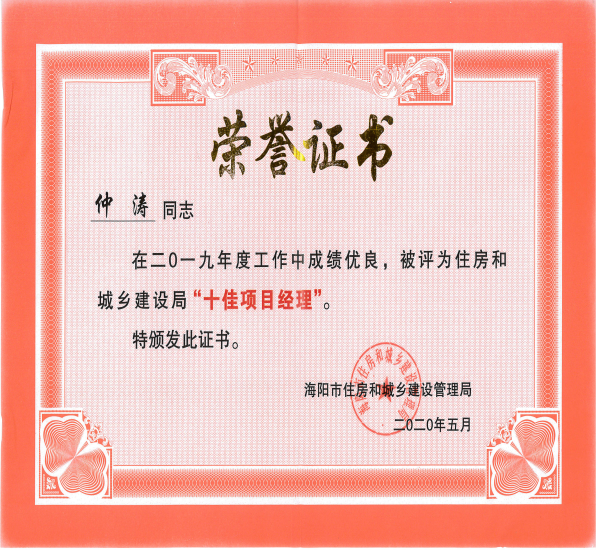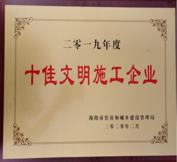 近日,集團(tuán)公司被海陽市住房和規(guī)劃建設(shè)管理局評(píng)為“二零一九年度十佳文明施工企業(yè)”榮譽(yù)稱號(hào),項(xiàng)目經(jīng)理仲濤被評(píng)為住房和城鄉(xiāng)建設(shè)局“十佳項(xiàng)目經(jīng)理”榮譽(yù)稱號(hào)。