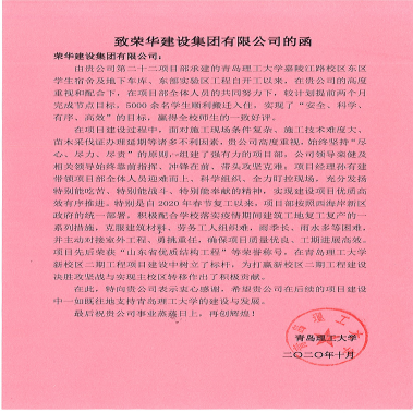 由寶利公司孫有建項(xiàng)目部承建的青島理工大學(xué)嘉陵江路校區(qū)東區(qū)學(xué)生宿舍及地下車庫(kù)、東部試驗(yàn)區(qū)工程,自開(kāi)工以來(lái),面對(duì)施工現(xiàn)場(chǎng)條件復(fù)雜,施工技術(shù)難度大等諸多不利因素,在項(xiàng)目部全體人員的共同努力下,提前兩個(gè)月完成節(jié)點(diǎn)目標(biāo),5000余名學(xué)生順利搬遷入住,贏得了全校師生的一致好評(píng)。為青島理工大學(xué)新校區(qū)二期工程建設(shè)中樹(shù)立了標(biāo)桿。特此青島理工大學(xué)黨委副書記楊興昌送來(lái)錦旗及表?yè)P(yáng)信,以感謝集團(tuán)公司在參與校區(qū)建設(shè)中做出的貢獻(xiàn)。