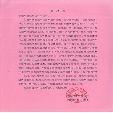 近期,集團(tuán)公司總部收到龍湖地產(chǎn)青島公司發(fā)來的表揚(yáng)信,對一分公司第十三(高洪龍)項目部施工的龍湖上合壹號項目提出表揚(yáng)。