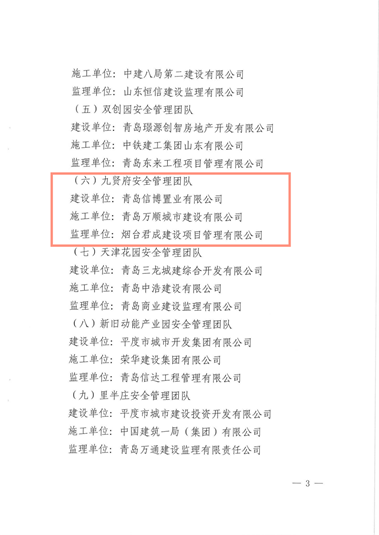 近日,平度市城鄉(xiāng)建設局發(fā)布了關(guān)于表彰房屋建筑工程優(yōu)秀安全管理團隊的通報,其中四公司第四十一孫承學項目部施工的平度市海信九賢府項目和二公司第十五李一項目部施工的海信鳳臺世家項目被評為優(yōu)秀項目安全管理團隊,為集團公司贏得了榮譽。 希望項目部繼續(xù)精益求精,堅持不懈,發(fā)揚不怕苦、不怕累的工作精神,用更多高質(zhì)量的好產(chǎn)品提升生活品質(zhì)、幸福億萬家庭!