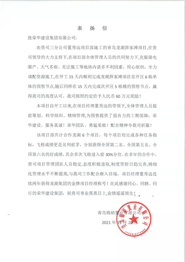 2021年11月20日,集團(tuán)公司收到青島錦裕置業(yè)有限公司發(fā)來(lái)的表?yè)P(yáng)信,對(duì)三公司第九(董秀遠(yuǎn))項(xiàng)目部施工的青島龍湖薛家灘項(xiàng)目提出表?yè)P(yáng)。