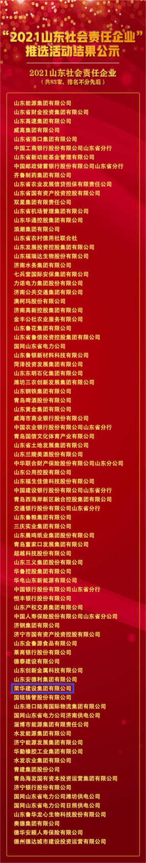 經過以上多個環(huán)節(jié)評審,我集團公司被推選為“2021山東社會責任企業(yè)”,這是在集團公司的領導下,企業(yè)邁向高質量發(fā)展,推進社會責任擔當?shù)木唧w體現(xiàn),也是對山東企業(yè)發(fā)展質量、生命力,以及企業(yè)家精神的一次檢驗。