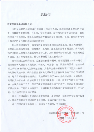 近日,集團(tuán)公司收到北京世茂嘉年華房地產(chǎn)開發(fā)有限公司發(fā)來的表揚(yáng)信,對(duì)八公司第二十九項(xiàng)目部施工的北京世茂軒景頌項(xiàng)目提出表揚(yáng)。