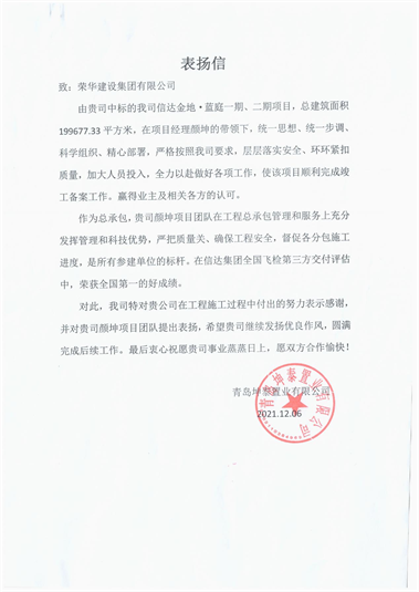 近日,集團(tuán)公司收到青島坤泰置業(yè)有限公司發(fā)來(lái)的表?yè)P(yáng)信,對(duì)開(kāi)發(fā)區(qū)公司顏坤項(xiàng)目部施工的信達(dá)金地·藍(lán)庭一期、二期項(xiàng)目提出表?yè)P(yáng)。