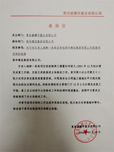 近日,集團(tuán)公司收到青島嘉耀華置業(yè)有限公司發(fā)來的表揚(yáng)信,對(duì)六公司張少杰項(xiàng)目部施工的石老人海鮮一條街項(xiàng)目工程提出表揚(yáng)。