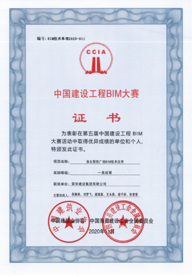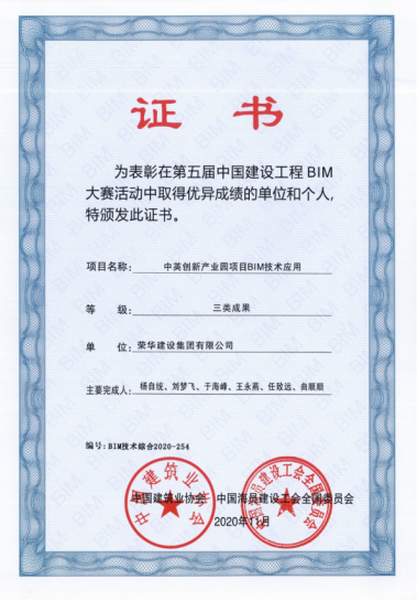 2020年12月16日,中國建筑業(yè)協(xié)會于武漢召開“第五屆建設工程BIM技術應用交流會”,集團BIM中心主編完成的《淮北吾悅廣場BIM技術應用》、《中英創(chuàng)新產業(yè)園項目BIM技術應用》分別榮獲第五屆中國建設工程BIM大賽單項一等獎和綜合三等獎。